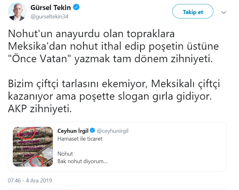 CHP İstanbul Milletvekili Gürsel Tekin yaptığı açıklamada, ''Nohut'un anayurdu olan topraklara Meksika'dan nohut ithal edip poşetin üstüne "Önce Vatan" yazmak tam dönem zihniyeti. Bizim çiftçi tarlasını ekemiyor, Meksikalı çiftçi kazanıyor ama poşette slogan gırla gidiyor. AKP zihniyeti'' ifadelerini kullandı.