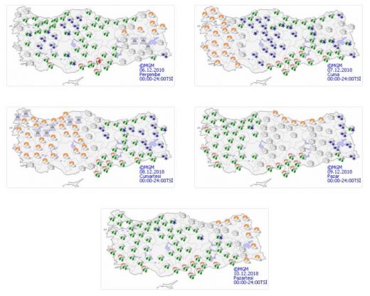 Meteoroloji Genel Müdürlüğü tarafından yapılan son değerlendirmelere göre; Marmara'nın güney ve doğusu, İç Ege, Akdeniz, İç Anadolu, Batı ve Orta Karadeniz, Doğu Karadeniz kıyıları ile Tekirdağ, Malatya, Şırnak, Hakkari, Gaziantep, Kilis, Adıyaman çevrelerinin yağışlı geçeceği tahmin ediliyor. Yağışların; genellikle yağmur ve sağanak, İç Ege, Batı Karadeniz'in iç kesimleri ile Eskişehir, Konya, Çankırı ve Hakkari çevrelerinde karla karışık yağmur ve yer yer kar şeklinde olması bekleniyor. Yağışların; Kocaeli, Sakarya ve Düzce çevreleri ile Bursa’nın doğu kesimlerinde kuvvetli (21-50 kg/m2), Mersin’in iç kesimleri ile Adana’nın batı ilçelerinde çok kuvvetli (21-75 kg/m2), Mersin merkez ve kıyı ilçelerinde şiddetli ve aşırı (100 kg/m2 ve üzeri) olacağı tahmin ediliyor.