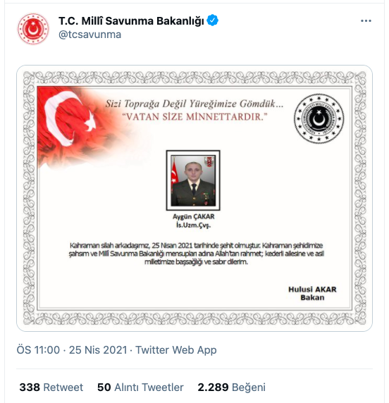 "Pençe-Şimşek harekâtı bölgesinde teröristler tarafından daha önceden döşenen bir EYP’nin patlaması sonucu yaralanan bir kahraman silah arkadaşımız tahliye edildiği Şht. Tümg. Aydoğan Aydın hastanesinde yapılan tüm müdahalelere rağmen kurtarılamayarak 25 Nisan 2021 tarihinde şehit olmuştur."