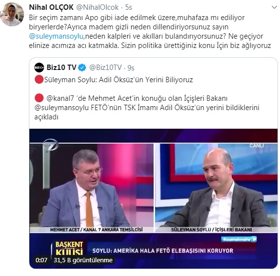 15 Temmuz darbe girişiminde eşi ve oğlunu kaybeden Nihal Olçok, İçişleri Bakanı Süleyman Soylu'nun Adil Öksüz ile ilgili sözlerine tepki gösterdi.