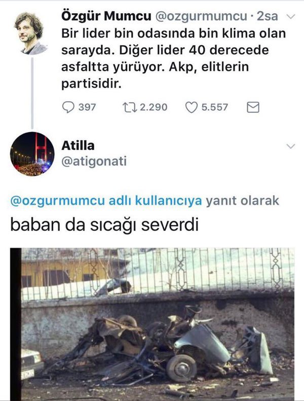 Cumhuriyet gazetesi yazarı Özgür Mumcu, CHP lideri Kemal Kılıçdaroğlu'nun sürdrüdüğü Adalet Yürüyüşüyle ilgili bir tweet attı, AKP Gaziantep milletvekili Şamil Tayyar kendine vazife çıkarıp cevap verdi. Diğer kullanıcılar da söz girince tartışma alevlendi. İşte tam da bu sırada Tayyar'ı destekleyen "@atigonati" kullanıcı hesabından insanlıktan nasibini almadığı belli olan bir tweet geldi. Özgür Mumcu'nun 1993 yılında aracına bomba konularak suikast düzenlenen gazeteci babası Uğur Mumcu'nun katledildiği otomobilin resmiyle "Baban da sıcağı severdi" tweeti sert tepkilere neden oldu.