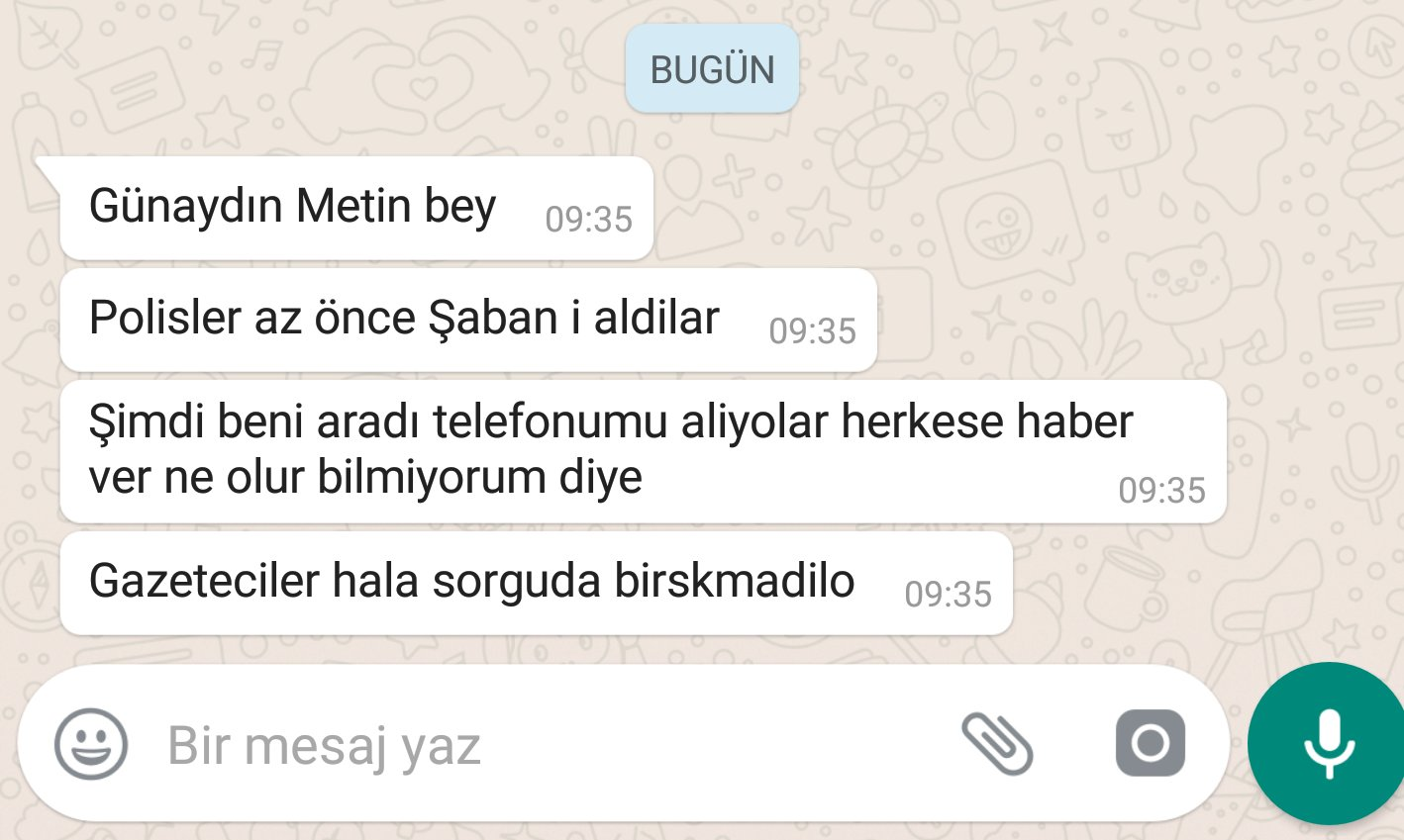 Atike Naz ise eşinin gözaltına alınmasının ardından gazeteci Metin Cihan’a bir mesaj gönderdi. Cihan, mesajı Twitter hesabından paylaştı.