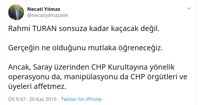 CHP'nin 25. ve 26. Dönem Ankara milletvekili Necati Yılmaz twitterdan Rahmi Turan'a tepki gösterdi. Yılmaz, "Rahmi TURAN sonsuza kadar kaçacak değil. Gerçeğin ne olduğunu mutlaka öğreneceğiz. Ancak, Saray üzerinden CHP Kurultayına yönelik operasyonu da, manipülasyonu da CHP örgütleri ve üyeleri affetmez." dedi.