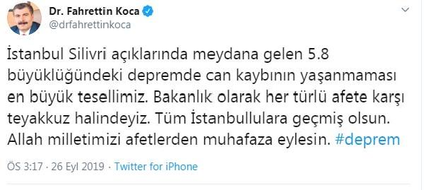 "İstanbul Silivri açıklarında meydana gelen 5.8 büyüklüğündeki depremde can kaybının yaşanmaması en büyük tesellimiz. Bakanlık olarak her türlü afete karşı teyakkuz halindeyiz. Tüm İstanbullulara geçmiş olsun. Allah milletimizi afetlerden muhafaza eylesin."