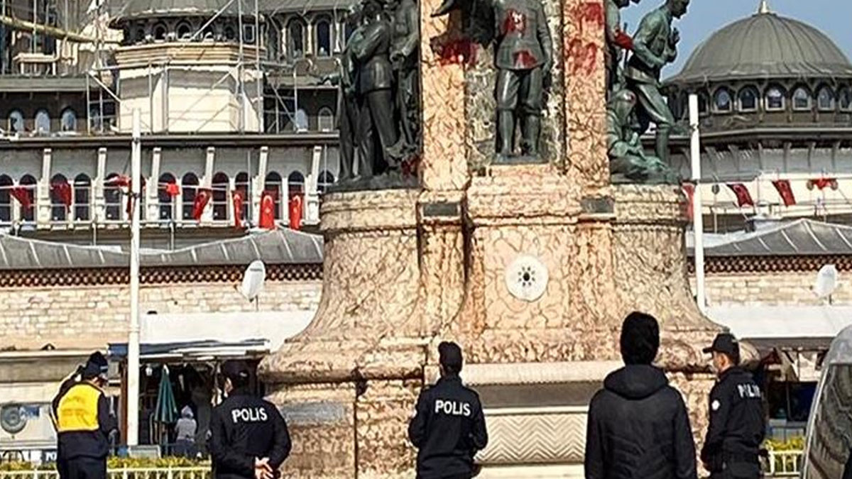 İstanbul'un simgelerinden Taksim Meydanı'ndaki Cumhuriyet Anıtı'na kırmızı boya atıldığı görüldü.