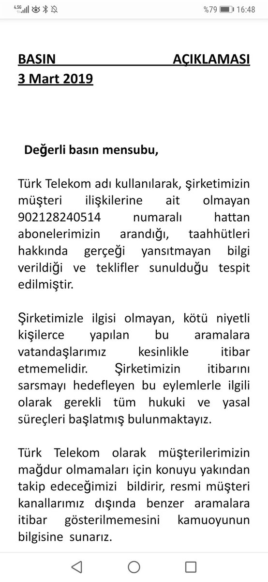 Türk Telekom yaptığı açıklamada; "Şirketimizin müşteri ilişkilerine ait olmayan 0212 8240514 numaralı hattan abonelerimizin arandığı gerçeği yansıtmayan bilgi verildiği ve teklifler sunduğu tespit edilmiştir. Şirketimizle ilgili olmayan, kötü niyetli kişilerce yapılan bu aramalara vatandaşlarımız kesinlikle itibar etmemelidir denildi.