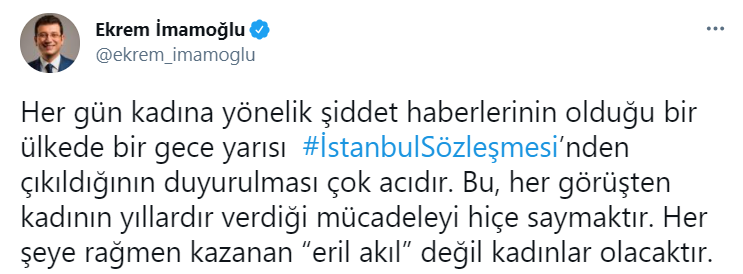 Türkiye'nin, Cumhurbaşkanlığı kararıyla kadınların yaşam hakkını savunan İstanbul Sözleşmesi'nden ayrıldığı Resmi Gazete'de duyurulmuştu. Sözleşmenin feshedilmesi kararı büyük tepkiye yol açtı. İmamoğlu da Twitter hesabından yaptığı paylaşımda "Her gün kadına yönelik şiddet haberlerinin olduğu bir ülkede bir gece yarısı #İstanbulSözleşmesi’nden çıkıldığının duyurulması çok acıdır. Bu, her görüşten kadının yıllardır verdiği mücadeleyi hiçe saymaktır. Her şeye rağmen kazanan “eril akıl” değil kadınlar olacaktır" ifadelerini kullandı.
