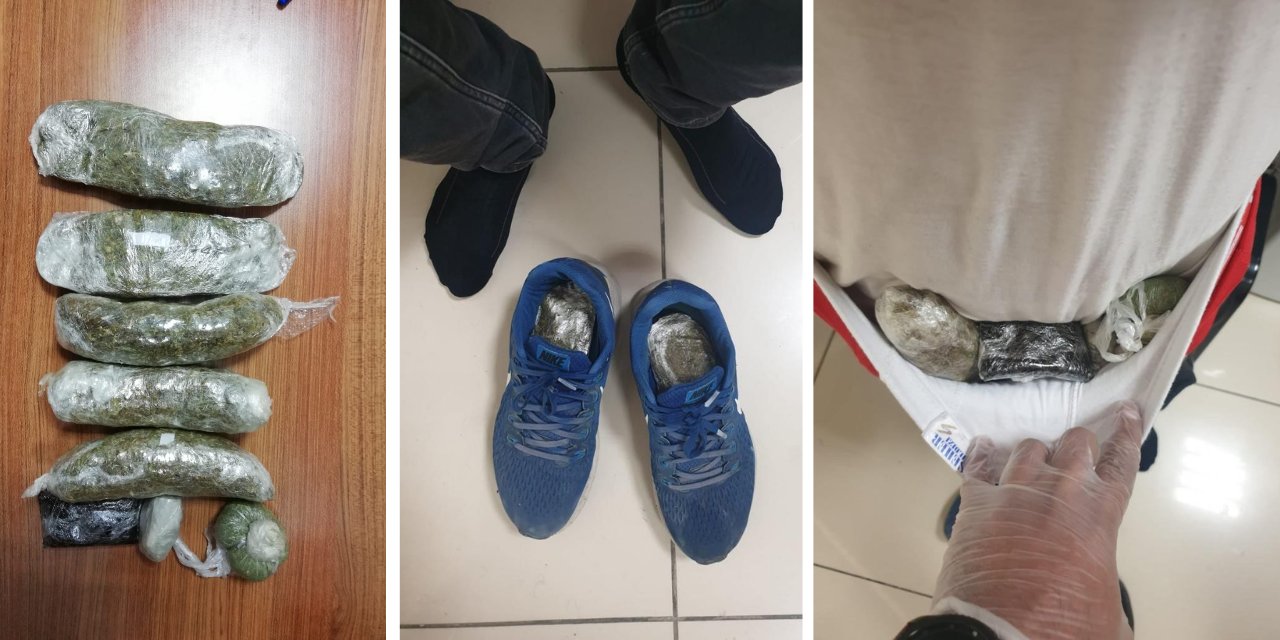Şüphelinin üst aramasında iç çamaşırına gizlenmiş 465,97 gram esrar ve 50,82 gram afyon sakızı ele geçirildi.