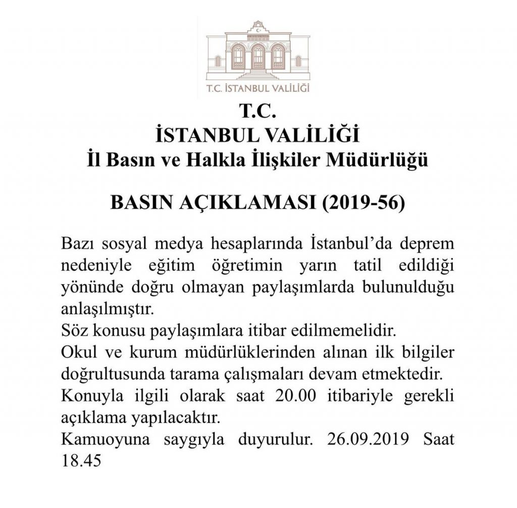 "Bazı sosyal medya hesaplarında İstanbul’da deprem nedeniyle eğitim öğretimin yarın tatil edildiği yönünde doğru olmayan paylaşımlarda bulunulduğu anlaşılmıştır.