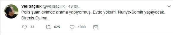 KHK ile ihraç edildikleri işlerine dönebilmek için eylem başlatan Veli Saçılık'ın evine polis baskını düzenlendi. Polis baskınını sosyal medya hesabından duyuran Veli Saçılık, "Polis şu an evimde arama yapıyormuş. Evde yokum. Nuriye-Semih yaşayacak. Direniş Daima" ifadelerini kullandı. Terörle Mücadele Ekipleri, “Yasa dışı örgüt üyeliği” gerekçesiyle Veli Saçılık, Esra Özakça, Acun Karadağ, Nazife Onay, Nazan Bozkurt, Abidin Sırma’nın evinde arama yaptı.
