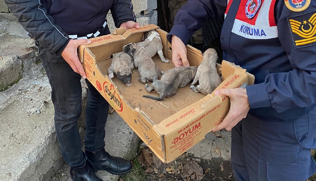 Yavru köpekleri donmak üzereyken jandarma kurtardı