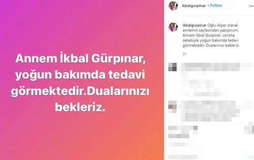 Eylül ayının başında koronavirüse yakalanan babası Murtaza Dönmez’i kaybeden Gürpınar, koronavirüs nedeniyle yoğun bakıma alındı. Oğlu Alper, sosyal medya hesabında yaptığı paylaşımla annesinin yoğun bakımda olduğunu duyurup dua istedi. Sevenlerinden dua isteyen Alper paylaşımında, "Oğlu Alper olarak annemin sayfasından yazıyorum. Annem İkbal Gürpınar, corona sebebiyle yoğun bakımda tedavi görmektedir. Dualarınızı bekleriz." dedi.