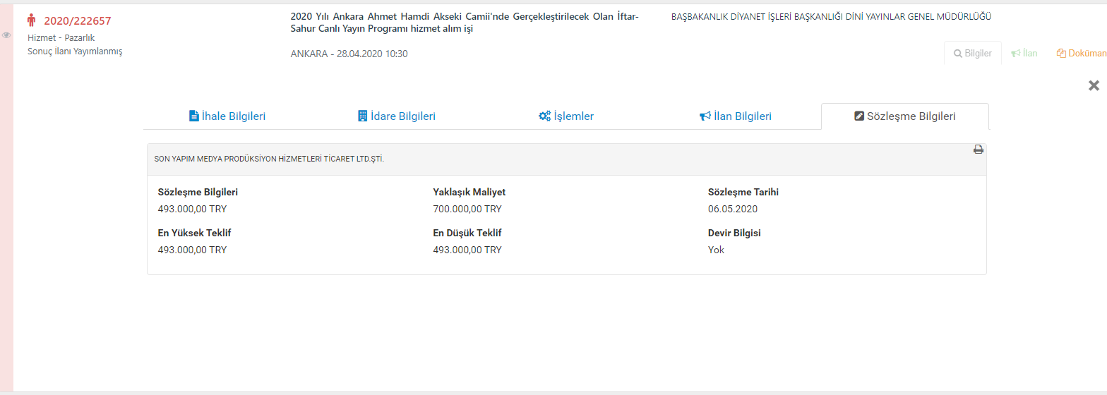 Mesela (2020/222657 kayıt numaralı) “İftar-Sahur Canlı Yayın Programı Hizmet Alımı” işini 21-b kapsamında pazarlık usulü ile gerçekleştirmiş.