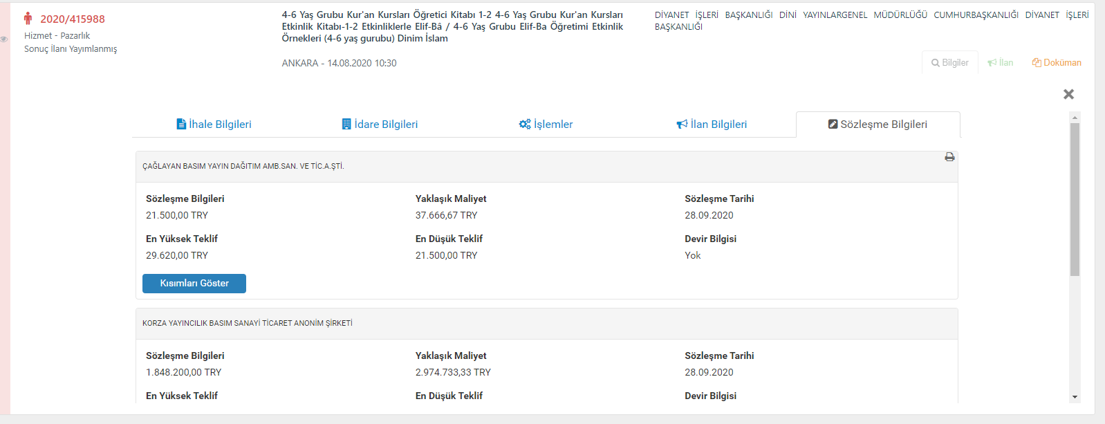 Bir başka örnekte (2020/415988 kayıt numaralı) “4-6 Yaş Grubu Muhtelif Kitap İşi” ihalesini yine 21-b kapsamında pazarlık usulü ile gerçekleştirmiş.