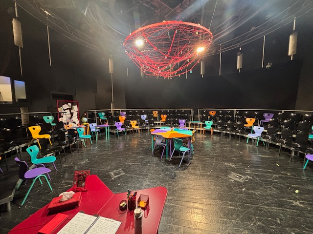 Gidion’un Düğümü için sahne bir ilkokul dersliğine, fuaye de okulun koridoruna dönüştürülmüş. Seyirci için oyun, tiyatro binasının kapısından girmesiyle başlıyor. Koridorda çınlayan öğrenci seslerini duymak, duvarlarda çocukların çizdiği resimleri görmek, kapı girişinde derslik numarasının olduğu tabela, sahneden geçerek yerine oturmak seyirciyi az sonra yaşanacaklara hazırlayan, iyi planlanmış bir ön oyun. Siyah renkli oturma düzeninin arasına serpiştirilmiş rengarenk sınıf sandalyeleri, sahne ortasında altıgen masa ile kenarlarda öğretmen ve öğrencilerin masaları, panolar, ödevler, tavanda asılı düğümler ve kilitler, oyuna hizmet eden, seyircinin yakalamaktan keyif alacağı çok sayıda detay ile artık bir tiyatroda değil, az sonra gerçekleşecek öğretmen veli görüşmesinin olacağı, 418 numaralı sınıfın içindesiniz. Ve zil sesi ile oyuncular sahneye girer, Gidion’un hikayesi de başlar. İyi seyirler.