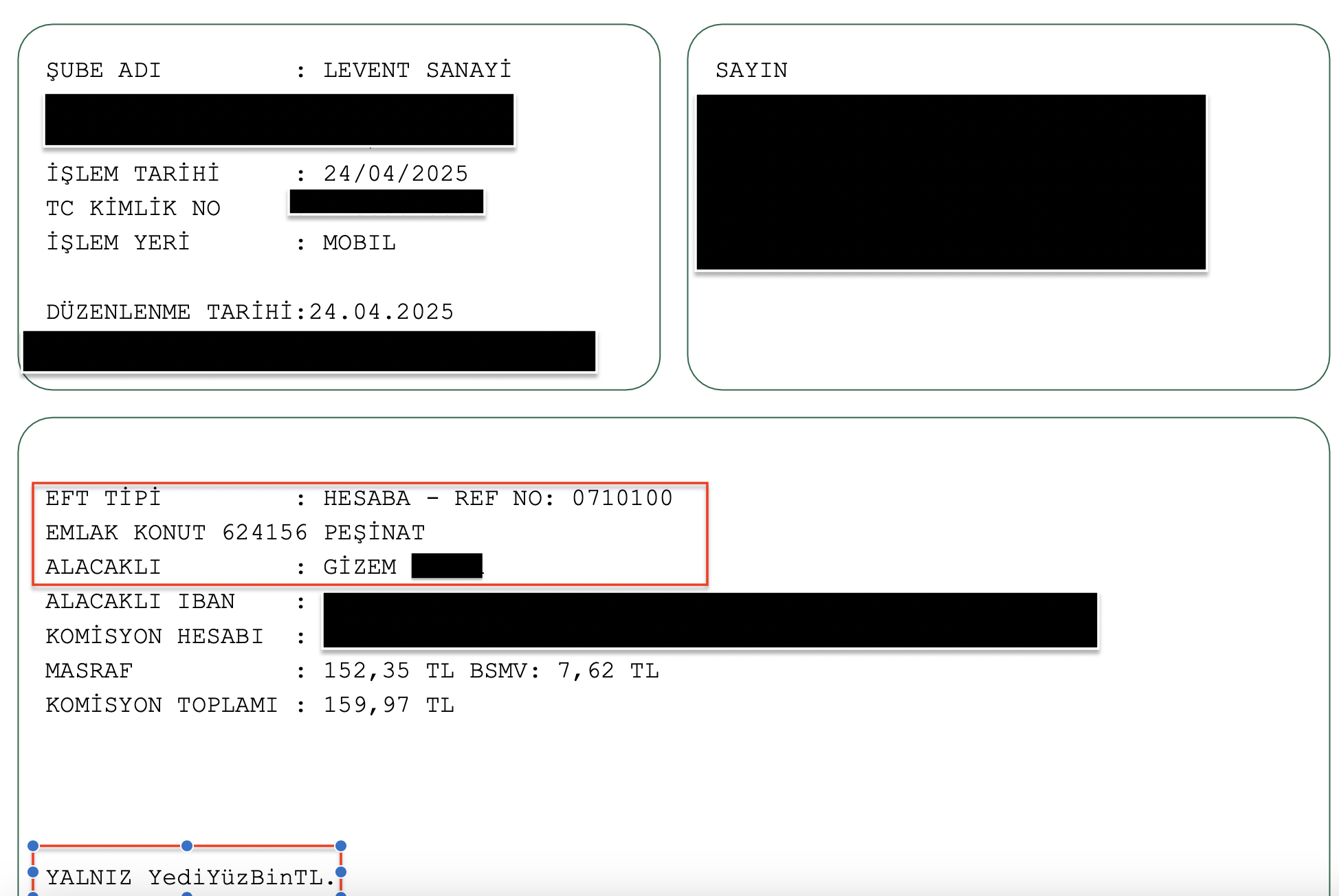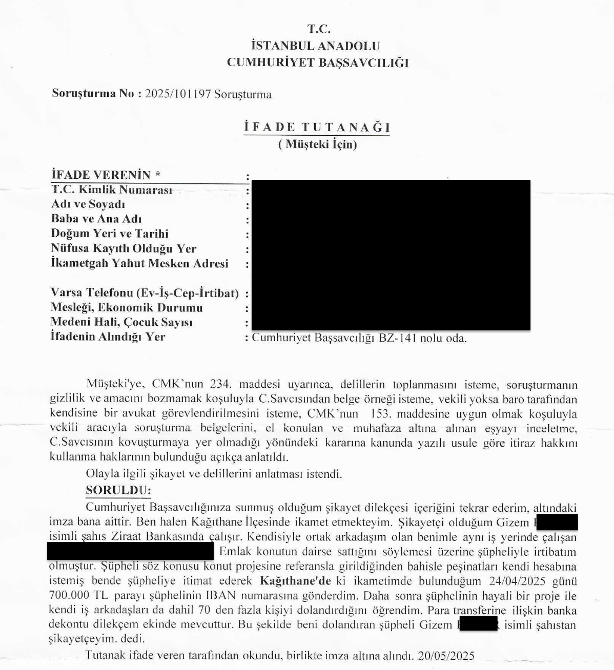 “Şikayetçi olduğum Gizem B. isimli şahıs Ziraat Bankası’nda çalışır. Kendisi ile ortak arkadaşım olan benimle aynı iş yerinde çalışan E.I. Emlak Konut’un saire sattığını söylemesi üzerine şüpheli ile irtibatım olmuştur. Şüpheli söz konusu konut projesine referans ile girildiğini anlattı. Kendisinin referans olacağını belirterek peşinatın da kendi hesabına yatırılmasını istedi. Ben de 24/04/2025 günü 700.000 TL’yi şüphelinin IBAN’ına gönderdim. Daha sonra şüphelinin hayali bir proje ile kendi iş arkadaşları da dahil 70’ten fazla kişiyi dolandırdığını öğrendim.”