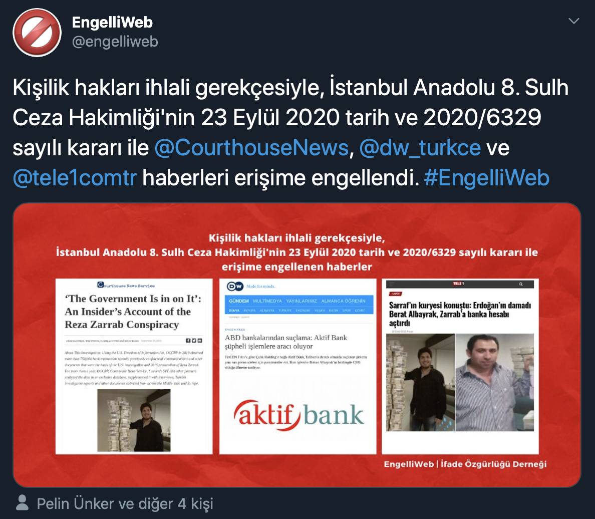 Rıza Sarraf'ın para trafiğini anlatan kuryesinin haberine kişilik hakları ihlali gerekçe gösterilerek erişim engeli getirildi.