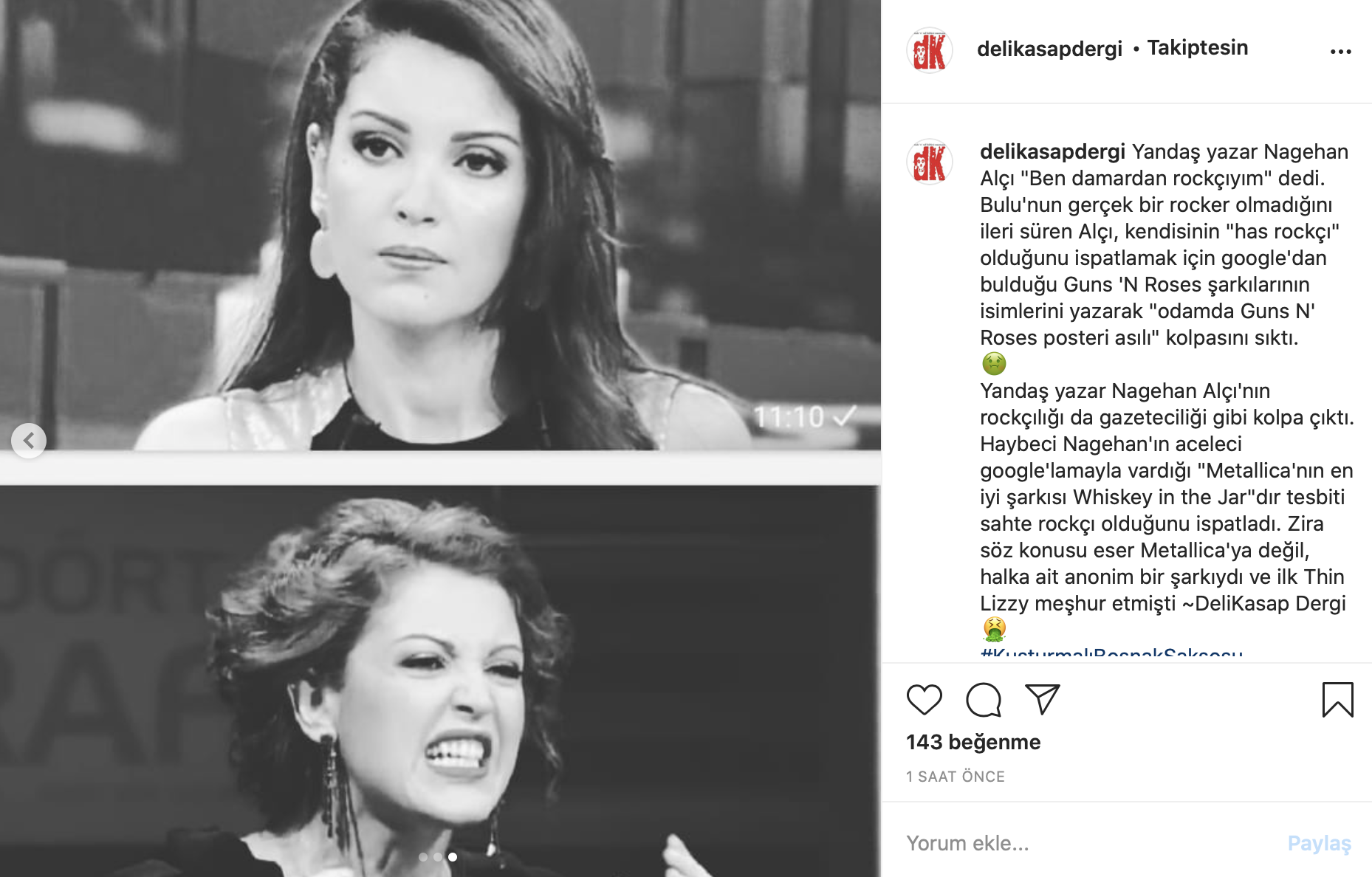 Derginin sosyal medya hesabından yapılan paylaşımda “Yandaş yazar Nagehan Alçı "Ben damardan rockçıyım" dedi. Bulu'nun gerçek bir rocker olmadığını ileri süren Alçı, kendisinin "has rockçı" olduğunu ispatlamak için google'dan bulduğu Guns 'N Roses şarkılarının isimlerini yazarak "odamda Guns N' Roses posteri asılı" kolpasını sıktı. Yandaş yazar Nagehan Alçı'nın rockçılığı da gazeteciliği gibi kolpa çıktı. Haybeci Nagehan'ın aceleci google'lamayla vardığı "Metallica'nın en iyi şarkısı Whiskey in the Jar"dır tesbiti sahte rockçı olduğunu ispatladı. Zira söz konusu eser Metallica'ya değil, halka ait anonim bir şarkıydı ve ilk Thin Lizzy meşhur etmişti ifadelerini kullandı.