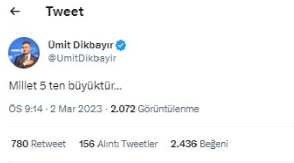 Meral Akşener'in en yakın kurmayı önce paylaştı sonra sildi. Ümit Dikbayır, sosyal medya hesabından yaptığı 'Millet beşten büyüktür' paylaşımı gündeme oturdu.