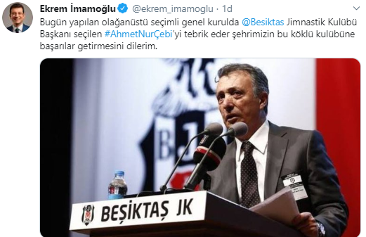 "Bugün yapılan olağanüstü seçimli genel kurulda @Besikta Jimnastik Kulübü Başkanı seçilen #AhmetNurÇebi’yi tebrik eder şehrimizin bu köklü kulübüne başarılar getirmesini dilerim."