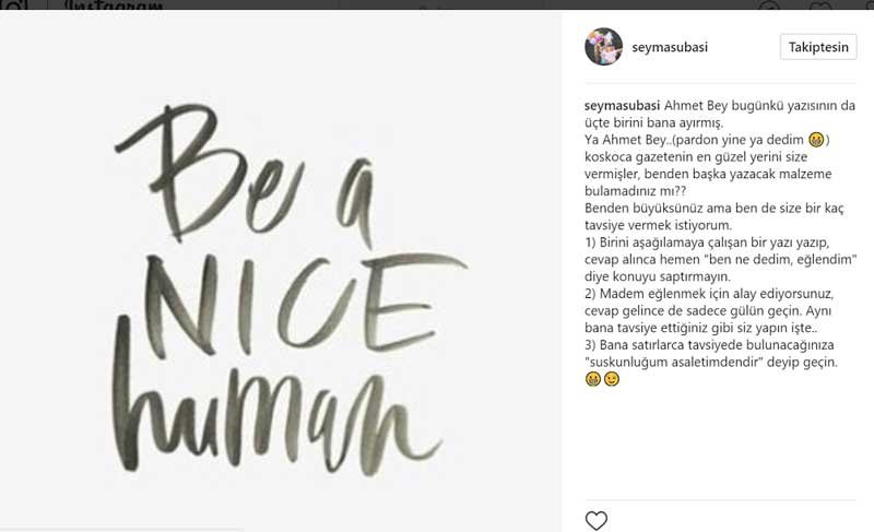 Geçtiğimiz günlerde Magazin dünyasının ünlü ismi Şeyma Subaşı, Hürriyet gazetesine verdiği röportajın ardından Ahmet Hakan’ın hakkında yazdığı köşe yazısına sosyal medya hesabından çok sert cevap verdi. Ahmet Hakan'da kendisini eleştiren Şeyma Subaşı'na yanıt verdi..