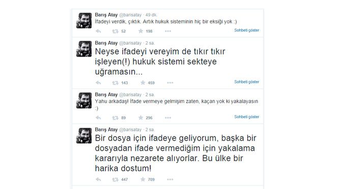 “Bir dosya için ifadeye geliyorum, başka bir dosyadan ifade vermediğim için yakalama kararıyla nezarete alıyorlar. Bu ülke bir harika dostum! Yahu arkadaş! İfade vermeye gelmişim zaten, kaçan yok ki yakalayasın. Neyse ifadeyi vereyim de tıkır tıkır işleyen(!) hukuk sistemi sekteye uğramasın… İfadeyi verdik, çıktık. Artık hukuk sisteminin hiç bir eksiği yok.”