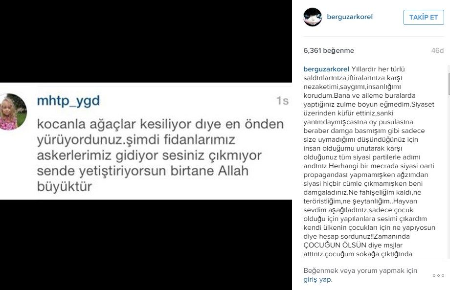 Her güne yeni bir şehit haberiyle başlarken sadece siyaset değil halk da son derece gergin. Bu gerginliğin tezahürü de kendisini en iyi şekilde ünlülerin paylaşımlarına gösterilen tepkilerde ortaya çıkıyor. Bir kullanıcının Bergüzar Korel’e Gezi Parkı ve çocuğu üzerinden yaptığı eleştiri güzel oyuncuyu sonunda çileden çıkardı. Bir takipçisi tarafından “Kocanla ağaçlar kesiliyor diye en önden yürüyordunuz. Şimdi fidanlarımız askerlerimiz gidiyor, sesiniz çıkmıyor. Sen de yetiştiriyorsun bir tane Allah büyüktür” ifadeleriyle eleştirilen Bergüzar Korel, Instagram hesabından şunları söyledi:
