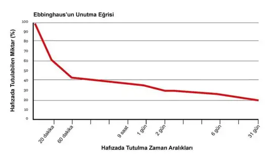Unutma eğrisi, modelin temeli olarak bir saatlik bir ders kullanarak algıladığımız bilgileri nasıl sakladığımızı veya kaybettiğimizi açıklar. Eğri, olayın bitiminden hemen sonra en yüksek noktasındadır (en fazla bilgi saklanır). Dersten bir gün sonra, materyalle hiçbir şey yapmazsanız bilgilerin yüzde 50 ila 80'ini kaybedersiniz.