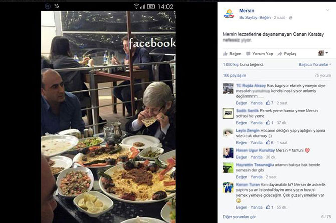 Fotoğraf Facebook’ta paylaşılır paylaşılmaz yorum yağmaya başladı. Bütün açıklamalarında ısrarla ‘ekmek yemeyin’ diyen Prof Karatay’ın bu fotoğrafı daha çok konuşulacağa benziyor. Fotoğrafın haberolması üzerine bir açıklama yapan Canan Karatay, yediğinin ekmek değil lahmacun olduğunu açıkladı.