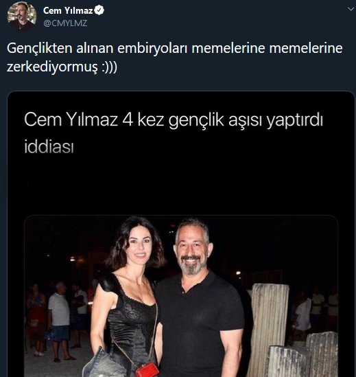 İlk olarak geride bıraktığımız hafta yaklaşık 2 yıldır birlikte olduğu sevgilisi Defne Samyeli’den ayrılacağı iddialarını Samyeli ile çektiği bir video ile yalanlama yoluna giden Cem Yılmaz, gençlik aşısı yaptırdığına dair çıkan haberleri de yine twitter hesabı üzerinden yalanlamayı tercih etti.