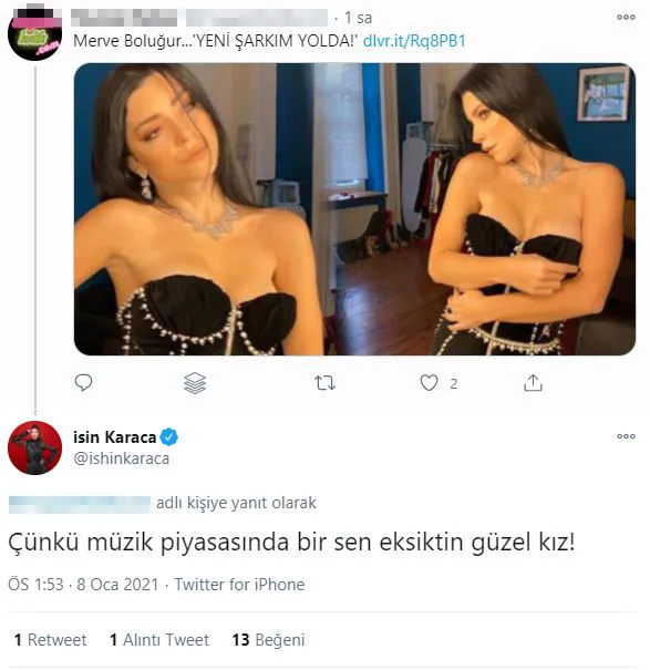 Işın Karaca ise Twitter hesabından, "Çünkü müzik piyasasında bir sen eksiktin güzel kız!" ifadelerini kullandı.