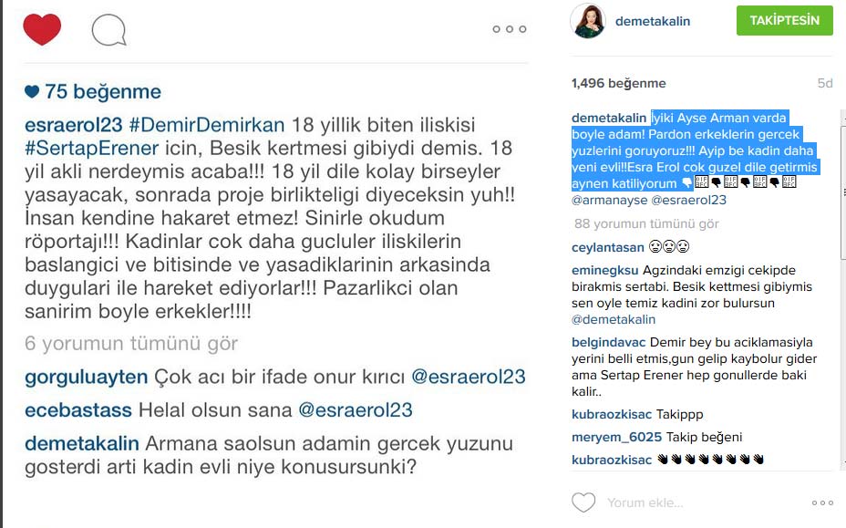 Sunucu Esra Erol’un bu sert ifadelerini kendi sosyal medya hesabından paylaşan Demet Akalın da başarılı sunucuya sonuna kadar destek vermiş ve duygularını “İyi ki Ayşe Arman var da böyle adam! Pardon erkeklerin gerçek yüzlerini görüyoruz! Ayıp be kadın daha yeni evli! Esra Erol çok güzel dile getirmiş aynen katılıyorum.”