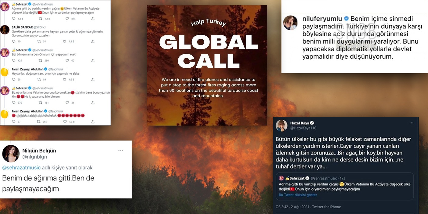 Birçok ünlü yardım çağrısına destek verdi ancak aralarında Mehmet Ali Erbil, Şehrazat, Nilüfer ve Nilgün Belgün'ün bulunduğu bir grup isim bu paylaşımlarla 'Türkiye'nin aciz gösterilmeye çalışıldığını' savunarak #helpturkey etiketine destek vermeyip, eleştirdi. İşte ünlülerin paylaşımları;