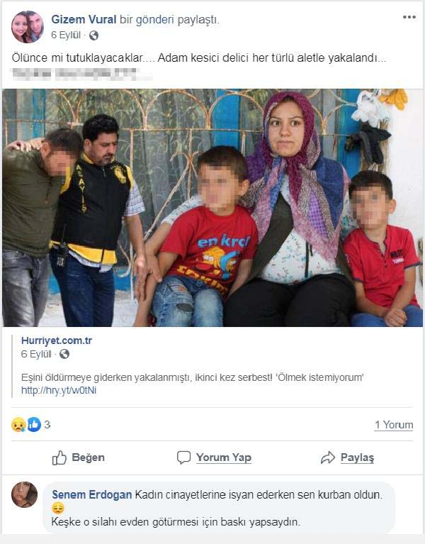 Gizem Vural Dik'in, Aksaray'da eşi tarafından öldürülmeye çalışılan Kezban Ç'nin isyanını paylaşarak, "Ölünce mi tutuklayacaklar? Adam kesici delici her türlü aletle yakalandı" mesajını yazdığı görüldü.