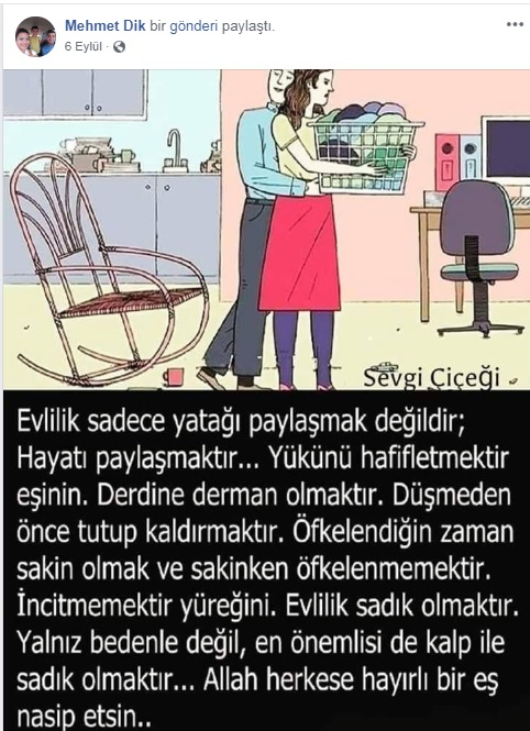 6 Eylül'de cinayet zanlısı Mehmet Dik'in yaptığı paylaşım da dikkat çekti. Polisin arama çalışmalarını sürdürdüğü cinayet zanlısı Mehmet Dik ise, "Evlilik sadece yatağı paylaşmak değildir, hayatı paylaşmaktır, yükünü hafifletmektir eşinin, derdine derman olmaktır, düşmeden önce tutup kaldırmaktır, öfkelendiğin zaman sakin olmak ve sakinken öfkelenmemektir, incitmemektir yüreğini. Evlilik sadık olmaktır. Yalnız bedenle değil, en önemlisi de kalp ile sadık olmaktır. Allah herkese hayırlı bir eş nasip etsin" paylaşımında bulunduğu görüldü.