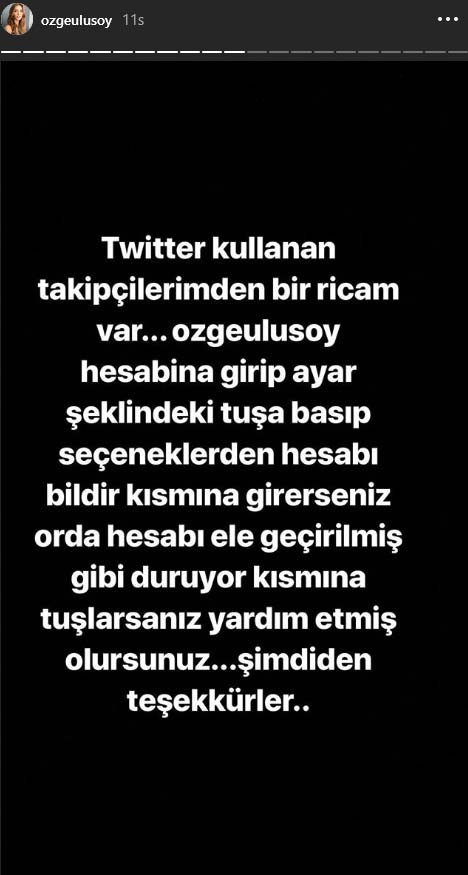 Özge Ulusoy, dün Instagram hesabından yaptığı paylaşımla Twitter hesabının çalındığını duyurdu.