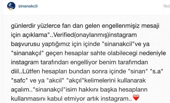 Ünlü bir ismin sosyal medya üzerinden hayranlarıyla haberleşmesi artık gündelik hayatın bir parçası oldu. Hatta bazı isimler sosyal medyada öylesine aktif ki neredeyse her adımlarını hayranlarının dikkatine ve ilgisine sunuyor. Mecra böylesine önemli olunca da ünlü ismin kullandığı sosyal medya hesabının gerçek olması büyük önem taşıyor. Çok sayıda hayranı olan Sinan Akçıl da bu gerçeğin bilinciyle onaylanmış bir instagram hesabı sahibi olmak adına harekete geçmiş ve bu sürecin getirdiği bir sonuç olarak bazı hayranlarının hesapları silinmiş. Akçıl, takipçilerini silme hareketinin kendisinden kaynaklanmadığını instagram hesabından şu sözlerle duyurmuş: