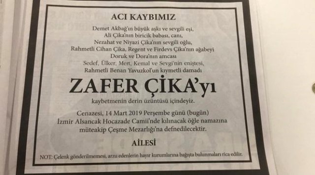 Bugün de gazetelerde Zafer Çika'nın ailesi tarafından ölüm ilanı yayınlandı. İlanda şunlar yazıyor: "Demet Akbağ'ın büyük aşkı ve sevgili eşi, Ali Çika'nın biricik babası, canı, Nezahat ve Niyazi Çika'nın sevgili oğlu, Rahmetli Cihan Çika, Regent ve Firdevs Çika'nın ağabeyi Doruk ve Dora'nın amcası Sedef, Ülker, Mert, Kemal ve Sevgi'nin eniştesi, Rahmetli Benan Yavuzkol'un kıymetli damadı Zafer Çika'yı kaybetmenin derin üzüntüsü içindeyiz.